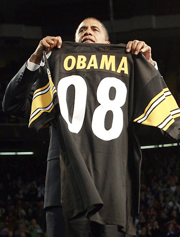 US Democratic presidential nominee Barack Obama holds up a Pittsburgh Steelers football jersey given to him by Dan Rooney, chairman of the Pittsburgh Steelers football team, during a campaign rally in Pittsburgh, Pennsylvania, October 27, 2008.[Agencies]
