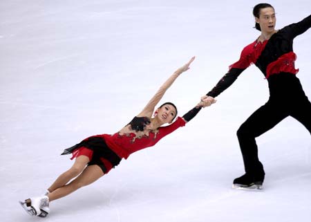 Pang Qing and Tong Jian of China skate during the pairs free skating competition at the Cup of China, part of the ISU Grand Prix of Figure Skating Series, being held at the Beijing Capital Gymnasium November 7, 2008.[Xinhua]