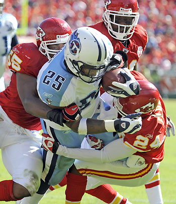 Tennessee Titans running back LenDale White is stopped short of the goal line by Kansas City Chiefs linebacker Pat Thomas (L) and cornerback Brandon Flowers (R) during the first half of their NFL football game at Arrowhead Stadium in Kansas City, Missouri October 19, 2008. [Agencies]