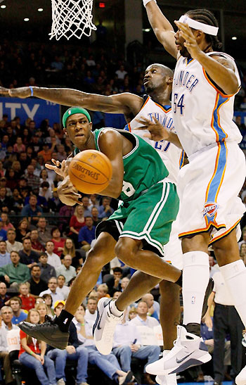 Boston Celtics guard Rajon Rondo (L) throws a pass against the defense of Oklahoma City Thunder center Johan Petro (C) and Thunder forward Chris Wilcox (R)in the first half of their NBA basketball game in Oklahoma City, Oklahoma November 5, 2008. [Agencies]