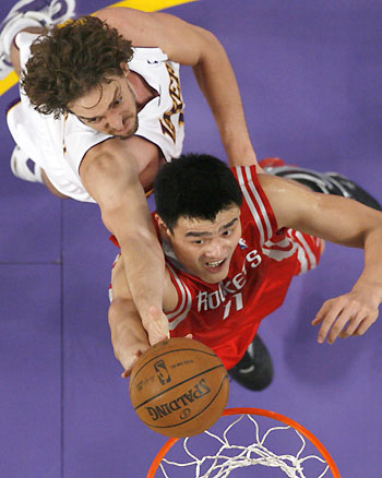 Los Angeles Lakers' Pau Gasol of Spain (top) strips the ball from Houston Rockets Yao Ming of China during their NBA basketball game in Los Angeles November 9, 2008.[Agencies]