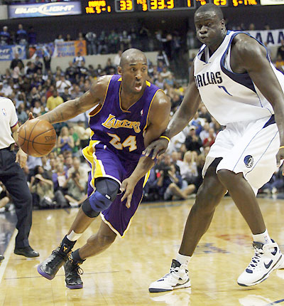 Los Angeles Lakers guard Kobe Bryant (L) drives past Dallas Mavericks center DeSagana Diop in the first half of their NBA basketball game in Dallas, Texas November 11, 2008. [Agencies]