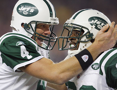 New York Jets quarterback Brett Favre (L) congratulates Jets wide receiver Jerricho Cotchery after Cotchery scored a touchdown against the New England Patriots on a pass from Favre in the second quarter of their NFL football game in Foxborough, Massachusetts November 13, 2008. [Agencies]