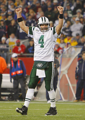 New York Jets quarterback Brett Favre celebrates after New York Jets running back Thomas Jones scored a touchdown against the New England Patriots in the fourth quarter of their NFL football game in Foxborough, Massachusetts November 13, 2008. [Agencies]