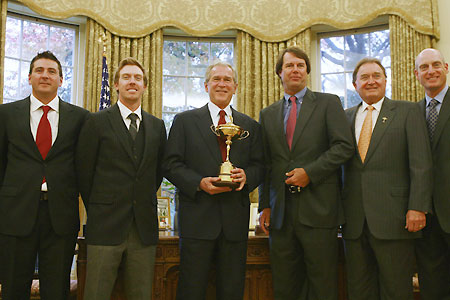Updated: 2008-11-18 12:16 WASHINGTON - Triumphant US Ryder Cup captain Paul Azinger and seven of his players were officially welcomed by President George W. Bush at the White House on Monday.