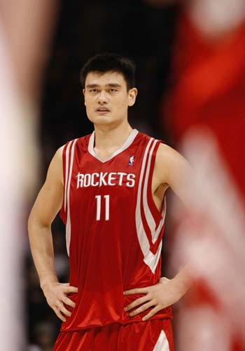 Houston Rockets center Yao Ming of China is framed by players as he watches as a teammate shoot a free throw in the second quarter of their NBA basketball game in Oklahoma City November 17, 2008.[Agencies]