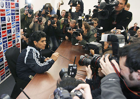 The football legend will make his debut since taking charge in Wednesday's friendly against Scotland at Hampden Park in Glasgow and already set his sights on making the breakthrough in South Africa in 2010. Asked whether he aimed for a place in the semifinals, Maradona told a news conference: "I don't like that at all, we're going for first. The path is to get there first, not in the top four." Argentina won the most-coveted trophy twice - the latest is when Maradona captained the team and led them to glory in Mexico in 1986, but have failed to reach the semifinals at the last four tournaments. While his appointment surprised many of the observers given his very limited coaching experience and history of drug and alcohol abuse, Maradona appears confident facing the challenge. "If I hadn't accepted (the job) I'd have been a coward and I always liked challenges," said the 48-year-old, who only had two short-lived previous attempts at coaching a decade ago. "It was what I'd been wanting for a long time. I've had my first chat with the players and I hope to get into their hearts. "It's going to be a hard road but I needed the national team and they needed a guide like me so here we are on the same path," added Maradona. |