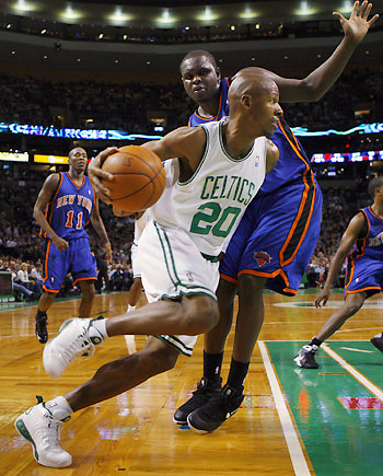Boston Celtics guard Ray Allen (20) drives to the basket around New York Knicks forward Zach Randolph in the second quarter of their NBA basketball game in Boston, Massachusetts November 18, 2008. [Agencies]