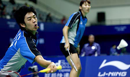 Lee Yong Dae (L) of South Korea returns the shuttle with his partner Lee Hyo Jung during the first round match against Koo Kien Keat/ Ng Hui Lin of Malaysia in the mixed doubles of Li Ning China Open Badminton Super Series 2008 in Shanghai, China, Nov. 19, 2008. Lee Yong Dae and Lee Hyo Jung won 2-1 (23-21, 19-21, 21-12). [Xinhua]