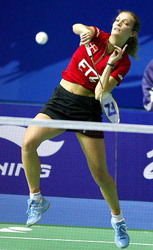 Tine Rasmussen of Denmark returns the shuttle during the first round match against China's Liu Jie in the women's singles of Li Ning China Open Badminton Super Series 2008 in Shanghai, China, Nov. 19, 2008.[Xinhua]