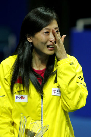China's two-time Olympic champion Zhang Ning wipes tears from her face during a ceremony in honor of her retirement with five other teammates from the national badminton team on the sidelines of the China Open badminton event in Shanghai, November 23, 2008. The 33-year-old veteran, who won gold in Athens and Beijing, has become the coach of the national women's team. [Xinhua]