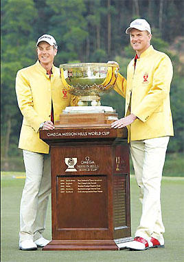 Going into the final day of action four shots off the pace, the pair charged up the leaderboard in the alternate shot format to tie Spain's Miguel Angel Jimenez and Pablo Larrazabal at the turn. They saved their best for last, however, and four more birdies helped them to a winning total of 27-under 261 for Sweden's first taste of the trophy since Per-Ulrik Johansson and Anders Forsbrand won the event in 1991. "We played fantastic today, obviously, to go out and shoot that score," said Stenson. "We felt like we could have a chance if we got going, and we did. I haven't had a win so far this year, and I've got one now, so I'm very pleased with that. And Robert can stack it up with all of the other ones he has already." The Spaniards shot 70 to finish second while joint overnight leaders Australia, represented by Brendan Jones and Richard Green, finished third with Japan after shooting a 76. Japan's Ryuji Imada and Toru Taniguchi proved Asia's best finishers after managing a 68 at the conclusion of the $5.5 million Omega Mission Hills World Cup in Shenzhen. Karlsson, who tops the European Tour this year with two victories, said he knew a low round in the more challenging foursomes was on the cards after Spain produced a 63 on Friday. "We thought it might be our turn today. We knew we needed to play better than yesterday. It was important for us to pick up a few shots early which we did," said the world No 12, who was making his third World Cup appearance but his first with Stenson. Stenson, who finished second in 2005 and third in 2006, was happy to end Sweden's 17-year drought at the vent. "It was about time we changed that and got our name up there again," he said. The Spanish, who were untouchable on Friday, could not replicate their leading performance down the final stretch. Jimenez and Larrazabal then ended on a low note by bogeying the last hole. "We didn't hole the putts today, and I missed the fairway on the par fives (where) we needed to make birdies," said Jimenez. "We didn't play like the first and second rounds, but still it was a good performance and a great tournament for us." The Australians keep par at the turn but a dropped shot on the 12th left them with an uphill task. Things got progressively worse as they bogeyed the final three for third place. "Just didn't happen for us today," said Green. "We went out there with all the right intentions (but) it was just a bit of a struggle most of the day." Imada, who has one title from this year's USPGA Tour, holed out from the bunker for an eagle on the 15th as Japan surged. "(Taniguchi) made a birdie putt on 14, and I got a little bit lucky and holed out a bunker shot on 15. We made a good save on 17 and a solid par on 18. It was a great finish," said Imada. China's Zhang Lianwei and Liang Wenchong shot a 72 to end on 280 and a share of 17th place with India. The Chinese pair was 11th last year. |