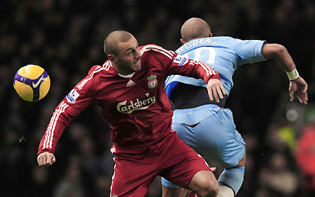 Liverpool's Andrea Dossena (L) challenges West Ham United's Julien Faubert during their English Premier League soccer match in Liverpool December 1, 2008. [Agencies]