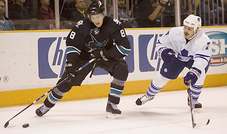 San Jose Sharks' Joe Pavelski (L) controls the puck in front of Toronto Maple Leafs' Ian White in the second period of their NHL hockey game in San Jose, California, December 2, 2008. [Agencies]