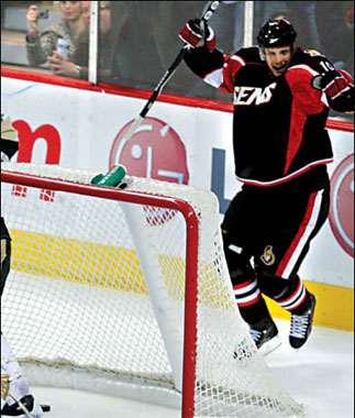 Spezza beat goalie Dany Sabourin three times in the second period. He has six goals in five games. Dany Heatley added a pair of assists and Alex Auld made 17 saves for Ottawa. NHL scoring leader Evgeni Malkin and Jordan Staal each had a goal and an assist for the Penguins. Malkin's goal was a short-handed effort, while Staal's came on the power play. Sidney Crosby had an assist to extend his point streak to six games. Bruins 4, Panthers 0 At Sunrise, Florida, Phil Kessel scored his team-leading 16th goal and Manny Fernandez won his seventh consecutive start as Boston beat Florida. Kessel has scored in five straight games and has six goals in that span. He also owns the NHL's longest current point streak - an 11-game run. Fernandez stopped 26 shots in his first shutout of the season. Michael Ryder, Shane Hnidy and Blake Wheeler also scored. David Krejci had three assists for the Bruins, who have won 16 of their last 19 games. Florida had its three-game winning streak and six-game point streak snapped. Devils 2, Canadiens 1, OT At Montreal, Zach Parise scored a power-play goal 31 seconds into overtime to lift New Jersey over Montreal and 4-1 on a a five-game road trip. Scott Clemmensen, who made 25 saves, became the first New Jersey goalie other than Martin Brodeur _ who had left elbow surgery in early November _ to start against the Canadiens since February 1997. Montreal fell to 3-1 on its team-record seven-game homestand. Canadiens rookie Matt D'Agostini scored for the third game in a row. Red Wings 5, Blackhawks 4 At Detroit, Pavel Datsyuk scored in a shootout to complete Detroit's comeback from a two-goal deficit. Valtteri Filppula had a goal and an assist and Henrik Zetterberg and Marian Hossa also scored for the Red Wings. Jonathan Toews scored twice, Andrew Ladd had a goal and an assist and Patrick Sharp added a goal for Chicago in regulation. Patrick Kane and Brian Campbell each had two assists. Flyers 2, Hurricanes 1, OT At Raleigh, North Carolina, Jeff Carter's NHL-leading 19th goal 3:34 into overtime carried Philadelphia past Carolina. Carter won a faceoff in the Carolina zone against Rod Brind'Amour, pivoted around him, and beat goalie Michael Leighton from the right side. The Hurricanes outshot the Flyers 36-31, but Antero Niittymaki was solid for Philadelphia, which played overtime for the fourth time in five games. The Flyers took the lead less than four minutes in on Mike Richards' 11th goal but Sergei Samsonov tied it with 19:05 remaining in regulation. Thrashers 5, Islanders 1 At Uniondale, New York, Ilya Kovalchuk's second-period goal helped Atlanta snap a five-game losing streak. Bryan Little, Eric Boulton, Eric Perrin and Chris Thorburn also scored for the Thrashers, who have beaten the Islanders twice this season. Johan Hedberg stopped 28 shots for his first win since the Thrashers' last victory over Toronto on Nov 25. Capitals 2, Maple Leafs 1 At Toronto, Milan Jurcina's third-period goal stood up as the winner and Washington beat Toronto. Karl Alzner also scored for Washington, and Nik Antropov had the only goal for the Maple Leafs. It might end up being a particularly costly loss for Toronto as Luke Schenn and Niklas Hagman both left the game during the second period with injuries. Agencies |