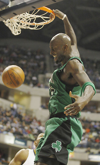 Boston Celtics forward Kevin Garnett dunks the basketball against the Indiana Pacers during the first quarter of their NBA basketball game in Indianapolis December 7, 2008. [Agencies]