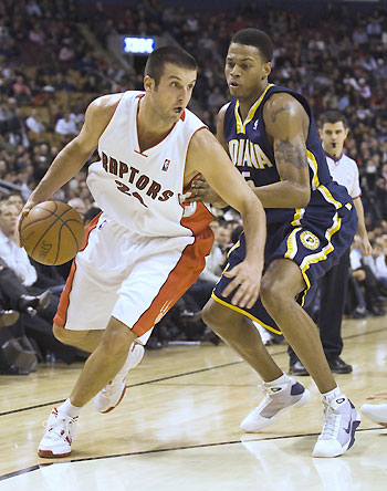 Toronto Raptors Jason Kapono is guarded by Indiana Pacers Brandon Rush (R) during the second half of their NBA basketball game in Toronto December 10, 2008. [Agencies]