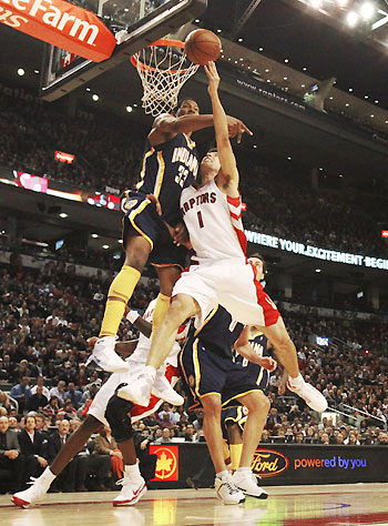 Toronto Raptors Roko Ukic goes to the basket against Indiana Pacers Danny Granger (L) during the first half of their NBA basketball game in Toronto December 10, 2008. [Agencies]