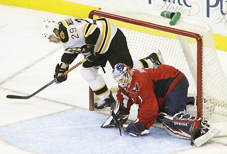 Petteri Nokelainen of the Boston Bruins (29) runs in to Washington Capitals goaltender Brent Johnson during the first period of their NHL hockey game in Washington December 10, 2008. [Agencies]