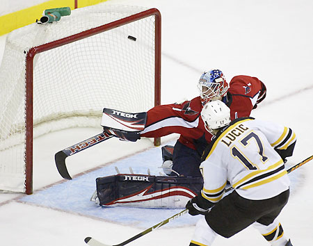 Boston Bruins' Milan Lucic (17) shoots the puck past Washington Capitals goaltender Brent Johnson and into the net for a goal in the second period of their NHL hockey game in Washington December 10, 2008. [Agencies]