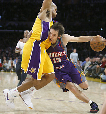 Phoenix Suns Steve Nash (R) drives into the defense of Los Angeles Lakers Derek Fisher during their NBA basketball game in Los Angeles December 10, 2008. [Agencies]