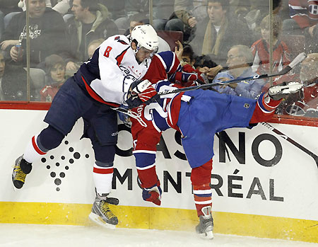 Washington Capitals' Alex Ovechkin (8) checks Montreal Canadiens' Josh Gorges (R) into the boards during the first period of NHL hockey action in Montreal December 13, 2008. [Agencies]