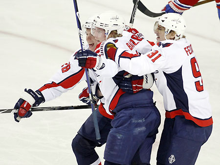 Washington Capitals' Nicklas Backstrom (C) is congratulated on his goal against Montreal Canadiens by teammates Sergei Fedorov (91) and Alexander Semin (28) during the first period of NHL hockey action in Montreal December 13, 2008. [Agencies]