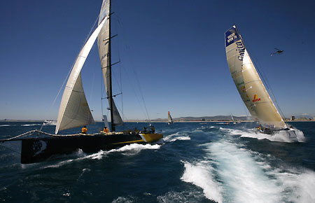 Yachts Team Russia and Telefonica Black depart Cape Town in the second leg of the 2008 Volvo Ocean Race November 15, 2008. [Agencies]