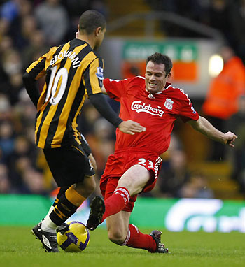 Liverpool fluffed the opportunity to open a four-point gap on second-placed Chelsea and it could have been even worse after they trailed 2-0 in the 22nd minute, the second Hull effort an own goal by Jamie Carragher. Luckily for the leaders two of their title rivals also dropped points. Champions Manchester United drew 0-0 at Tottenham Hotspur before flying off to compete in FIFA's World Club Cup in Japan while Arsenal were held 1-1 at Middlesbrough. Former Arsenal striker Jeremie Aliadiere earned Boro a point with a headed equaliser after Emmanuel Adebayor had put the Gunners in front. Chelsea was scheduled to play West Ham United on Sunday and it will go top if they win the match at Stamford Bridge.