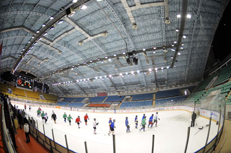 Ice hockey players attend a training session in Harbin of Northeast China's Heilongjiang Province December 16, 2008. The 11-day 24th Winter Universiade will kick off in Harbin Feberuray 18, 2009. [Xinhua]