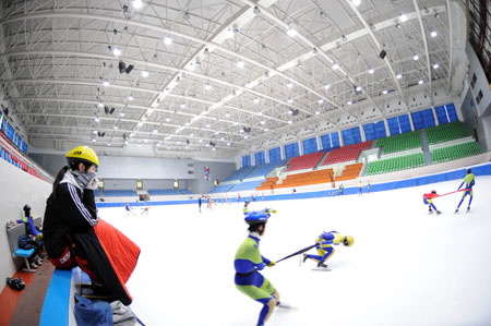 Ice hockey players attend a training session in Harbin of Northeast China's Heilongjiang Province December 16, 2008. The 11-day 24th Winter Universiade will kick off in Harbin Feberuray 18, 2009. [Xinhua]
