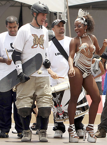 Brazilian skateboarder Bob Burnquist (L) dances with a samba dancer in a giant ramp during the Oi MegaRamp contest at the Sambadrome of Sao Paulo November 23, 2008. [Agencies]