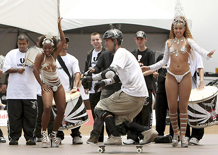 Brazilian skateboarder Bob Burnquist (C) performs in the giant ramp with samba dancers during the Oi MegaRamp contest at the Sambadrome of Sao Paulo November 23, 2008. [Agencies]