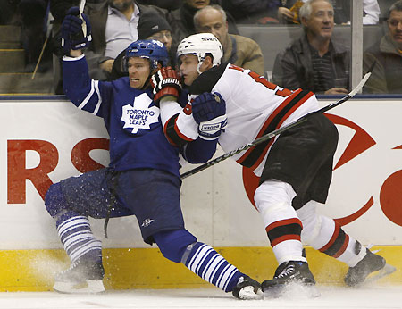 Toronto Maple Leafs forward Dominic Moore (L) is checked into the boards by New Jersey Devils defenseman Colin White during the second period of their NHL hockey game in Toronto, December 16, 2008. [Agencies]