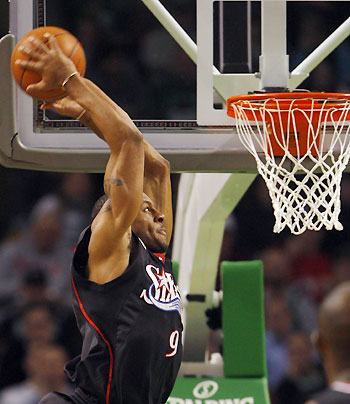 Philadelphia 76ers guard Andre Iguodala goes in for a dunk against the Boston Celtics in the second quarter of their NBA basketball game in Boston, Massachusetts December 23, 2008. [Agencies]