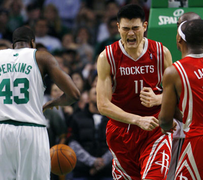 Updated: 2009-01-09 10:03 Houston Rockets center Yao Ming reacts after making a basket late in the fourth quarter of their NBA basketball game against the Boston Celtics in Boston, Massachusetts January 7, 2009. [Agencies]