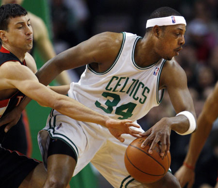 Paul Pierce scored a season-high 39 points despite a sore right knee for the Celtics, who held off the Raptors 94-88 in Toronto on Sunday to end a four-game losing streak. "There's players who play the game; there's players who absolutely love the game. Paul's one of those 'love' guys," Celtics coach Doc Rivers told reporters after Pierce was on the court for more than 49 minutes. "He's tough as nails... (and) he's able to play through pain because of the love for the game." Pierce nailed a three-pointer for the first points of the overtime session and the Celtics never trailed again. "Doc's been around me long enough to know that it takes a lot to keep me off the court," Pierce told reporters. "I was a little ginger but I was able to get some much-needed rest last night." Kevin Garnett added 20 points and 12 rebounds to help secure the 19th victory in 21 home games for the Atlantic Division-leading Celtics, who trailed by 10 points in the third quarter before rallying. Andrea Bargnani, who paced the Raptors with 23 points, forced overtime on a three-pointer with a second to play but was held scoreless in the extra session. "We shot ourselves in the foot tonight," the Raptors' Chris Bosh, who added 18 points and 11 rebounds, told reporters. "There were a couple rotations that we made mistakes," he noted. "On one (in overtime), we left the hottest guy on the court, Paul Pierce, open."