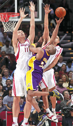 Updated: 2009-01-15 09:21 HOUSTON - Kobe Bryant's clutch three-pointer capped a 33-point performance and launched the Los Angeles Lakers to a 105-100 road win over the Houston Rockets on Tuesday. Bryant's long shot with 27 seconds remaining put the Lakers ahead 102-100 and they never trailed again, bringing the Rockets' three-game winning streak to an end. "I just rose up and hit it," Bryant told reporters after his only three-pointer of the game.