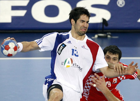 France's Nikola Karabatic (L) is held back by Croatia's Petar Metlicic during their Men's World Handball Championship gold medal match in Zagreb February 1, 2009. [Agencies]