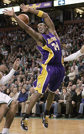 Los Angeles Lakers guard Kobe Bryant loses control of the ball while trying to make a pass against the Boston Celtics in second half action during their NBA basketball game in Boston, Massachusetts February 5, 2009. [Agencies]