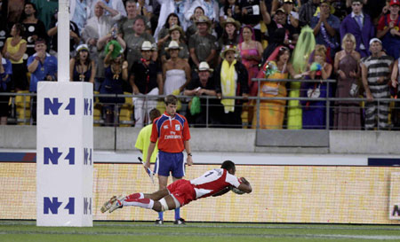 England's Isoa Damu scores the match winning try against New Zealand in the IRB Sevens World Series final rugby match in Wellington February 7, 2009. [Agencies]