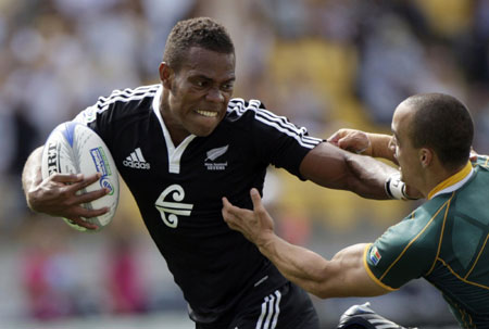 New Zealand's Lote Raikabula (L) scores a try as he is tackled by South Africa's Paul Delport during their IRB Sevens World Series quarter-final rugby match in Wellington February 7, 2009. [Agencies]