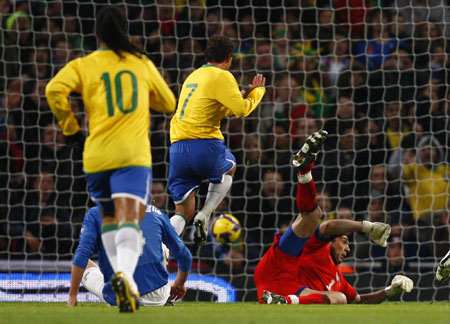 Brazil's Elano (C) shoots and scores his goal during their friendly international soccer match against Italy at The Emirates Stadium in London February 10, 2009. [Agencies]