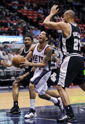 Updated: 2009-02-11 14:58 New Jersey Nets guard Devin Harris drives between San Antonio Spurs guard Roger Mason (L) and center Tim Duncan (21) in the second quarter of their NBA basketball game in East Rutherford, New Jersey, February 10, 2009. [Agencies] |