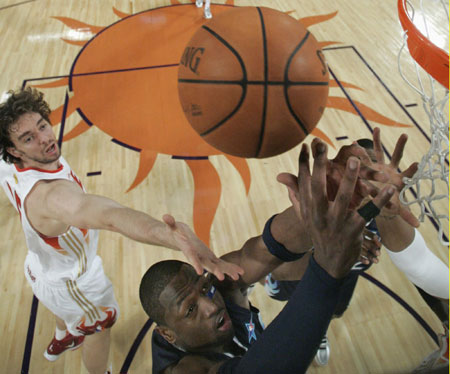 Updated: 2009-02-17 10:05 Miami Heat's Dwyane Wade and Los Angeles Lakers' Pau Gasol (L) battle for a rebound in the fourth quarter of the NBA All-Star basketball game in Phoenix, Arizona, February 15, 2009. [Agencies] |