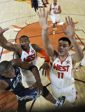 Updated: 2009-02-17 10:05 Houston Rockets' Yao Ming (R) tries to block the shot by Miami Heat's Dwyane Wade (L) as Phoenix Suns' Amar'e Stoudemire also defends in the third quarter of the NBA All-Star basketball game in Phoenix, Arizona, February 15, 2009. [Agencies] |