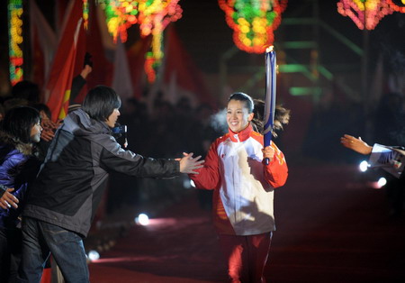 Torchbearers runs into Harbin International Conference, Exhibition and Sports Centre Gym at the opening ceremony of the 24th World Winter Universiade in Harbin, capital of northeast China's Heilongjiang Province, Feb.18, 2009. [Xinhua]