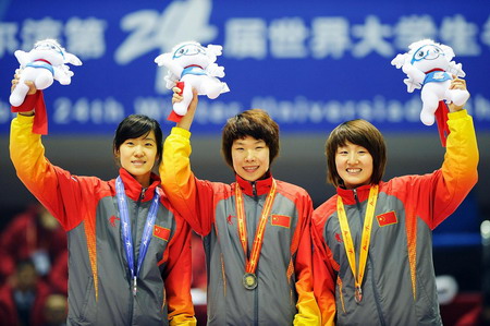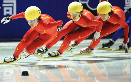 "South Koreans are very strong in the 1500m event and I am proud that my girls could break their monopoly today," said the team leader Wang Chunlu. The women's 1500m final turned to be a contest between China and South Korea, as each of the two powerhouses booked half of the six berths. South Korean Kim Hye Kyung, gold medalist in the Turin Universiade in 2007, took the lead in the early stage, before the top skater in the world rankings Zhou skated to dominate the group with four laps left. Zhou's compatriot Liu Qiuhong and Sun Linlin managed to block other South Koreans' way of counterattack and sealed the victory for China with Zhou clocking the fastest time of 2:31.658. Liu Qiuhong finished with the silver at 2:31.821 while Sun Linlin took the bronze, timed at 2:32.201.