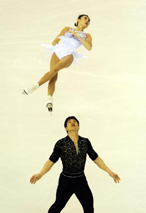 China's Zhang Dan (Top) and Zhang Hao perform during the pairs short program of figure skating at the 24th World Winter Universiade in the Harbin International Conference, Exhibition and Sports Center Gym in Harbin, capital of northeast China's Heilongjiang province, February 21, 2009. Zhang Dan and Zhang Hao ranked the 1st with 68.32 points in the competition. [Xinhua]