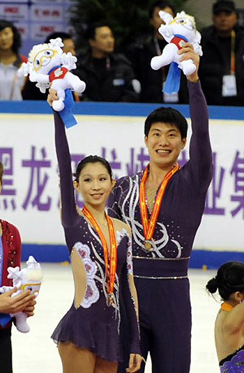 China's Zhang Dan/Zhang Hao (R) greet the audience during the awarding ceremony for the pairs final of figure skating in the 24th World Winter Universiade at Harbin International Conference, Exhibition and Sports Center Gym in Harbin, capital of northeast China's Heilongjiang province, February 22, 2009. Zhang Dan/Zhang Hao won the title of the event with a total of 195.32 points. [Xinhua]